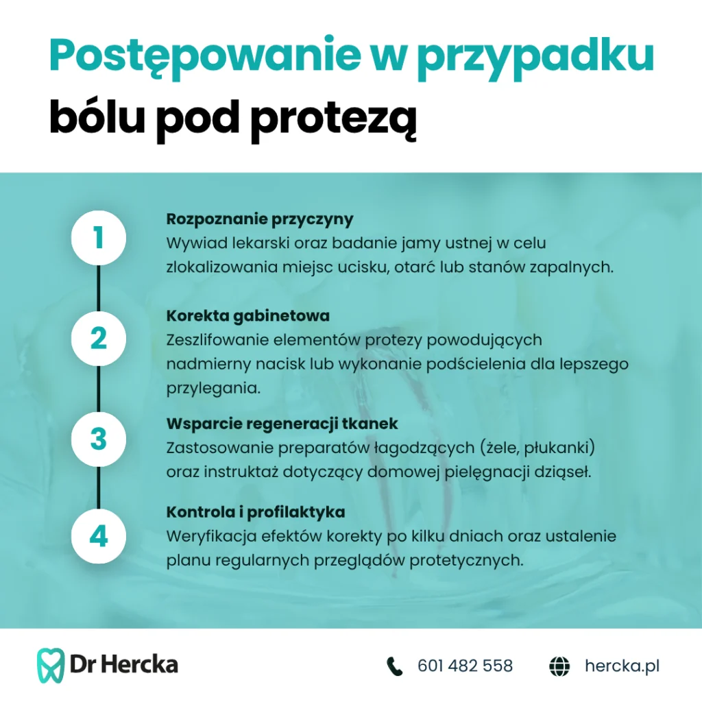 Jeśli jednak ból nie ustępuje, a wręcz narasta, pojawiają się owrzodzenia, krwawienia, stan zapalny lub obluzowanie protezy, nie jest to już zwykły dyskomfort. Takie objawy świadczą o tym, że proteza może być źle dopasowana albo doszło do infekcji. Wówczas konieczna jest konsultacja z dentystą, aby uniknąć pogłębiających się dolegliwości.