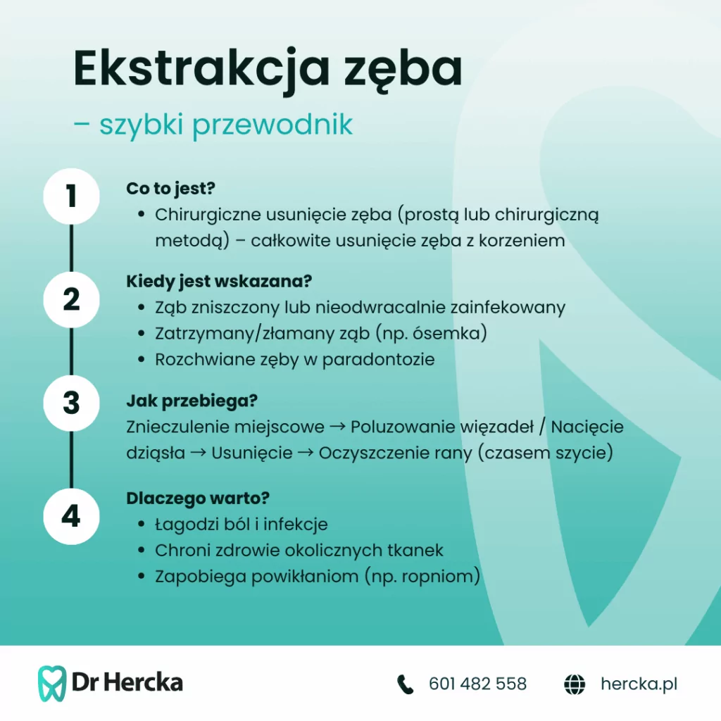 Sam proces ekstrakcji może być prosty, gdy dotyczy zębów jedno- lub dwukorzeniowych, albo bardziej skomplikowany – w przypadku zębów zatrzymanych, głęboko osadzonych lub uszkodzonych. Po zabiegu kluczowe jest przestrzeganie zaleceń stomatologa, aby uniknąć powikłań, takich jak suchy zębodół czy infekcja.