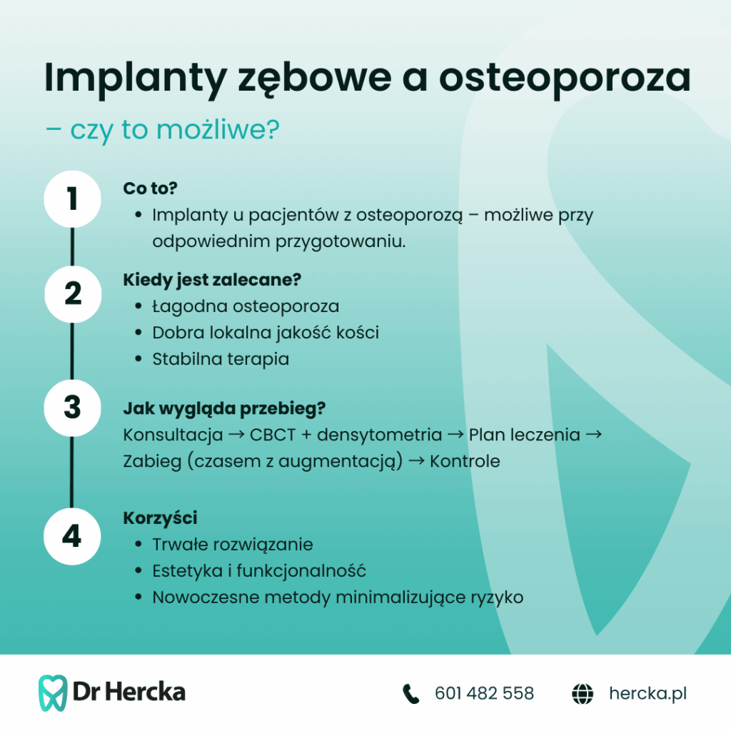 Dla pacjenta oznacza to większy komfort psychiczny i pewność, że leczenie implantologiczne nie koliduje z innymi aspektami terapii – co w przypadku osteoporozy jest szczególnie istotne.