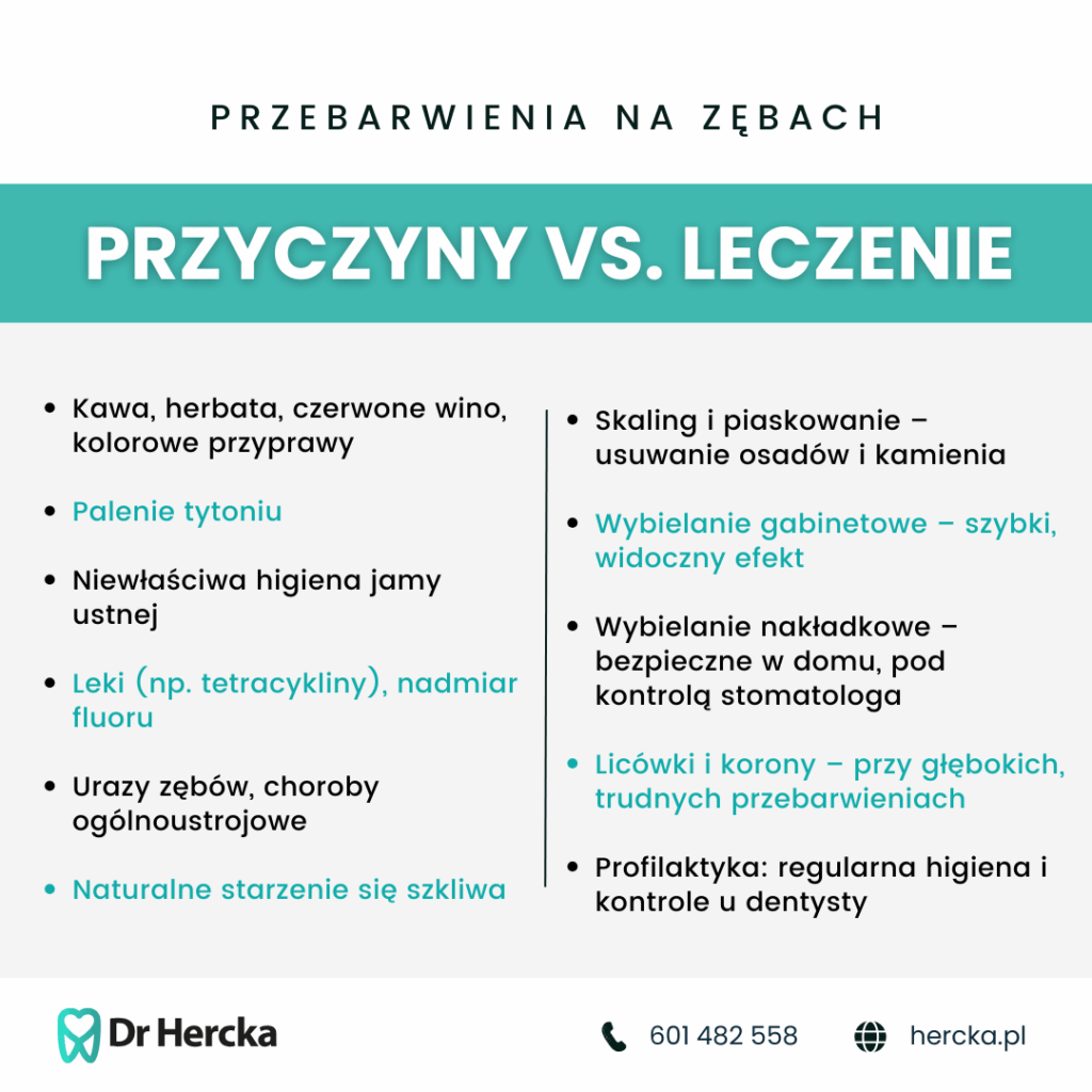 Jeśli zauważasz przebarwienia na swoich zębach i chcesz odzyskać naturalny, zdrowy uśmiech – skorzystaj z pomocy doświadczonego specjalisty. W gabinecie dr. Hercka otrzymasz indywidualną diagnozę, dostęp do nowoczesnych metod wybielania i kompleksowej opieki stomatologicznej. Niezależnie od przyczyny – jesteśmy tu po to, by Ci pomóc i zadbać o Twój uśmiech w sposób profesjonalny i bezpieczny.