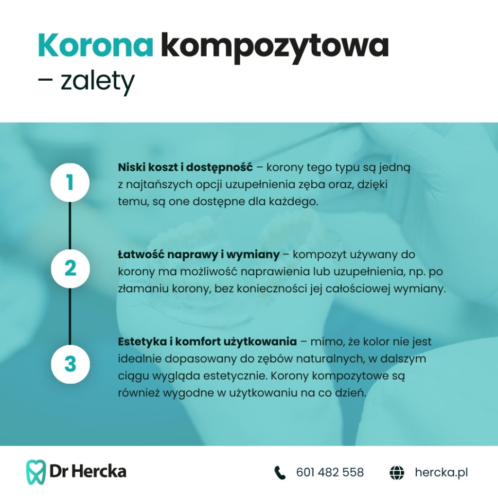 - Łatwość naprawy i wymiany – kompozyt używany do korony ma możliwość naprawienia lub uzupełnienia, np. po złamaniu korony, bez konieczności jej całościowej wymiany.