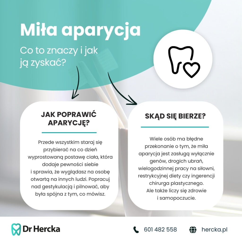 Aparycja to wygląd fizyczny, czyli figura, ubiór czy fryzura, ale również sposób poruszania się, gesty, pozycja jaką przybierasz podczas rozmowy, a także uśmiech. Ten ostatni ma tu fundamentalne znaczenie, bowiem osoby, które częściej się uśmiechają są postrzegane jako pozytywne, radosne i pewniejsze siebie. Poza tym wzbudzają sympatię, a wręcz przyciągają do siebie innych – nie da się ukryć, że do uśmiechniętej pani w sklepie przychodzi się na zakupy chętniej, niż do tej, która ma zawsze posępną minę.