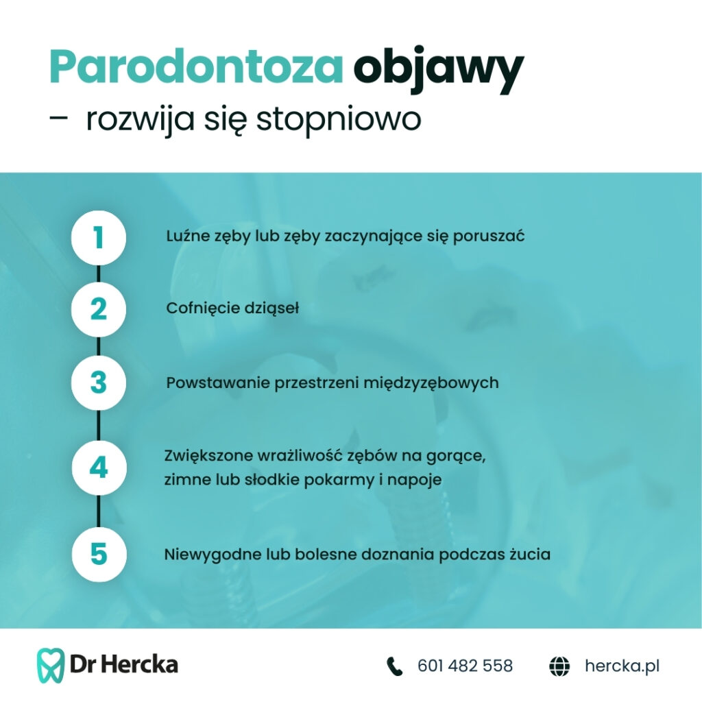 Paradontoza rozwija się stopniowo, zazwyczaj bezobjawowo przez wiele lat, co utrudnia jej wcześniejsze wykrycie.