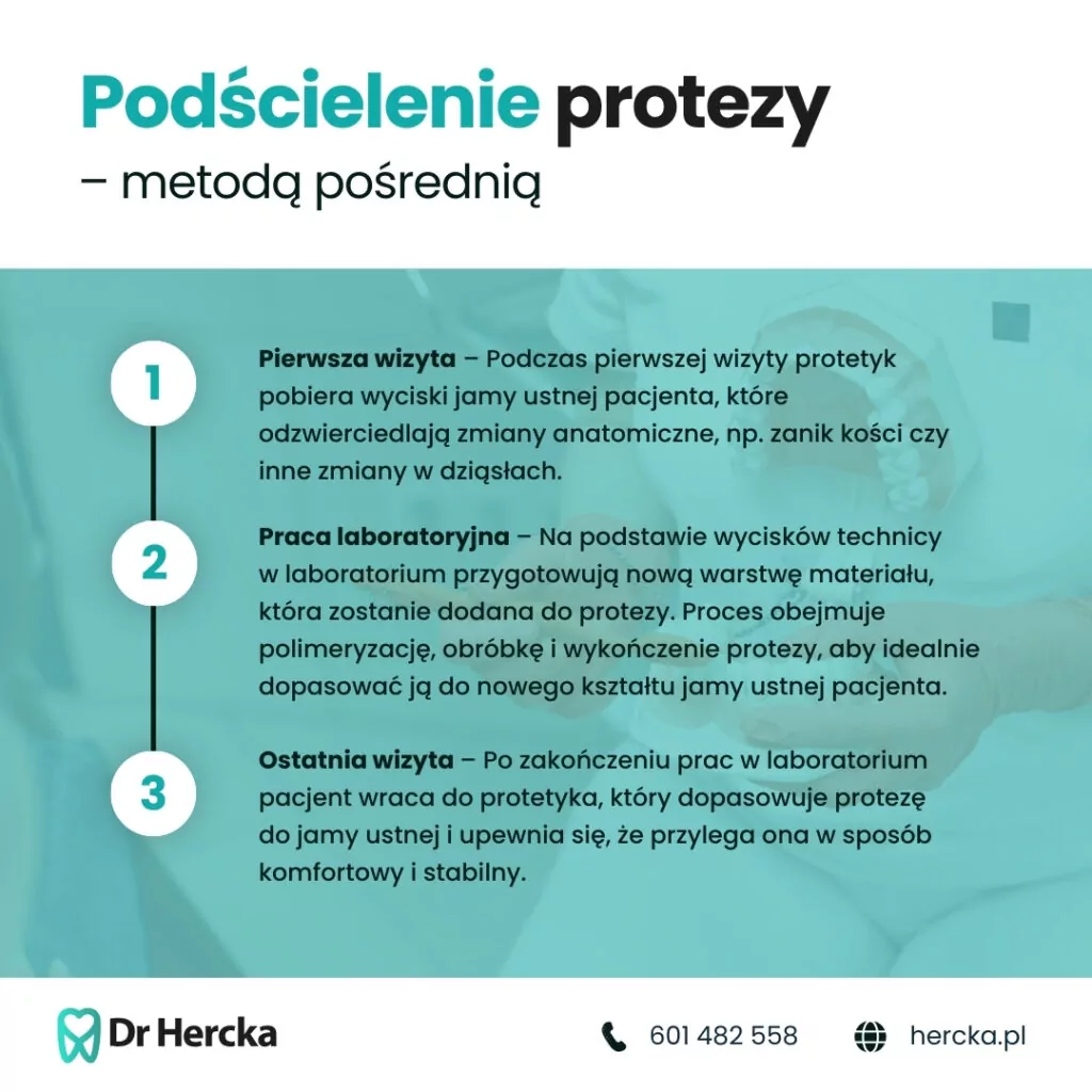 Metoda pośrednia jest stosowana, gdy zmiany w jamie ustnej są bardziej rozległe, np. po operacjach chirurgicznych, ekstrakcji zębów lub z powodu poważniejszego zaniku kości. Jest ona bardziej czasochłonna i wymaga większej precyzji, jednak daje lepsze rezultaty w przypadku pacjentów, u których proteza nie może być skutecznie poprawiona metodą bezpośrednią.