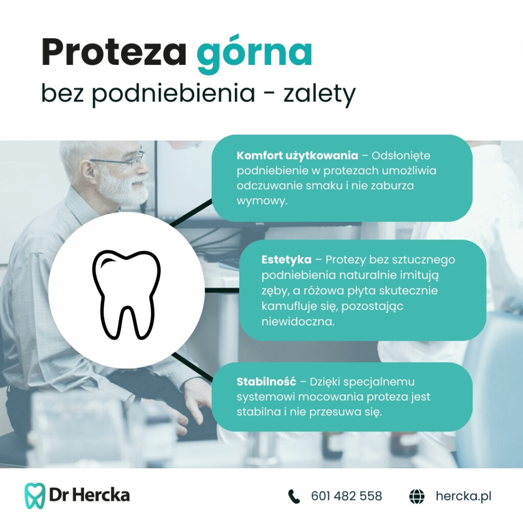 - Komfort użytkowania – odsłonięcie podniebienia pozwala użytkownikom tego typu protez na pełne odczuwanie smaku potraw i napojów oraz nie wpływa na wymowę.