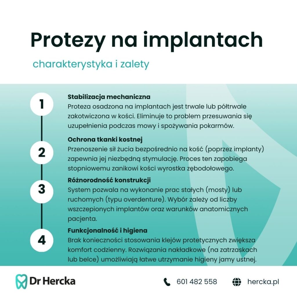 Protezy na implantach oferują większy komfort i stabilność niż tradycyjne protezy, eliminując przesuwanie się przy mówieniu i jedzeniu. Poprawiają estetykę twarzy i funkcję żucia. Jednak wymagają dobrej kondycji kości, wyższych kosztów i dbałości o higienę.Jeśli zastanawiasz się nad protezą na implantach, odwiedź gabinet Dr Hercka, gdzie otrzymasz pełne wsparcie i rozwiązanie dopasowane pod Ciebie!