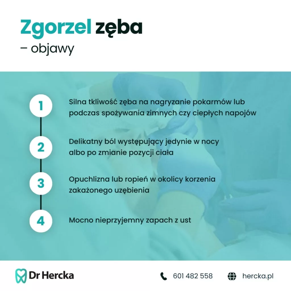 Rozpoczęty proces martwiczy nie zawsze musi objawiać się bólem, przynajmniej nie na początku. Jeśli zgorzel ma charakter otwarty, wówczas związki odpowiedzialne za rozkład białek, uwalniane są przez ubytek do jamy ustnej. W takim przypadku pierwszym objawem będzie mocno nieprzyjemny zapach z ust. Jakie jeszcze symptomy mogą świadczyć o martwicy zęba? Objawy to m.in.: silna tkliwość zęba na nagryzanie pokarmów lub podczas spożywania zimnych czy ciepłych napojów. Delikatny ból występujący jedynie w nocy albo po zmianie pozycji ciała? Za to również może odpowiadać zgorzel zęba. Opuchlizna lub ropień w okolicy korzenia zakażonego uzębienia – to także efekt bytujących wewnątrz zęba bakterii oraz rozpoczętych procesów martwiczych.